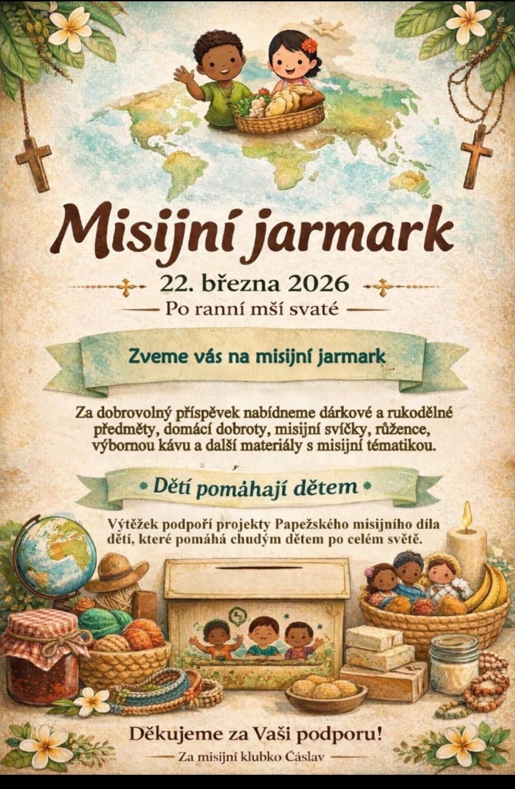 V neděli 22. 3. 2026 se v Čáslavi po ranní mši svaté uskuteční tradiční Misijní jarmark pořádaný čáslavským misijním klubkem. Za dobrovolný příspěvek se budou nabízet dekorativní předměty, které připravovali rodiče s dětmi či jiní dobrovolníci. Dále budou k dispozici misijní kalendáře, misijní růžence, omalovánky, svíčky a další materiály s misijní tematikou.