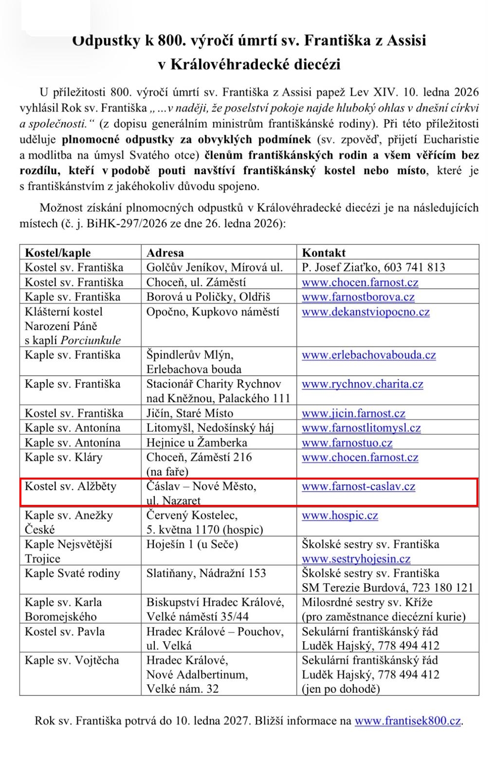 Vyhlásil papež LEV XIV. dne 10. ledna 2026. V rámci tohoto Roku (do 10.1.2027) mají věřící možnost získat plnomocné odpustky mimo jiné i při poutní návštěvě místa spojeného s františkánstvím. Máme radost, že takové místo je i v naší farnosti. Zveme poutníky do kostela sv. Alžběty v Čáslavi.