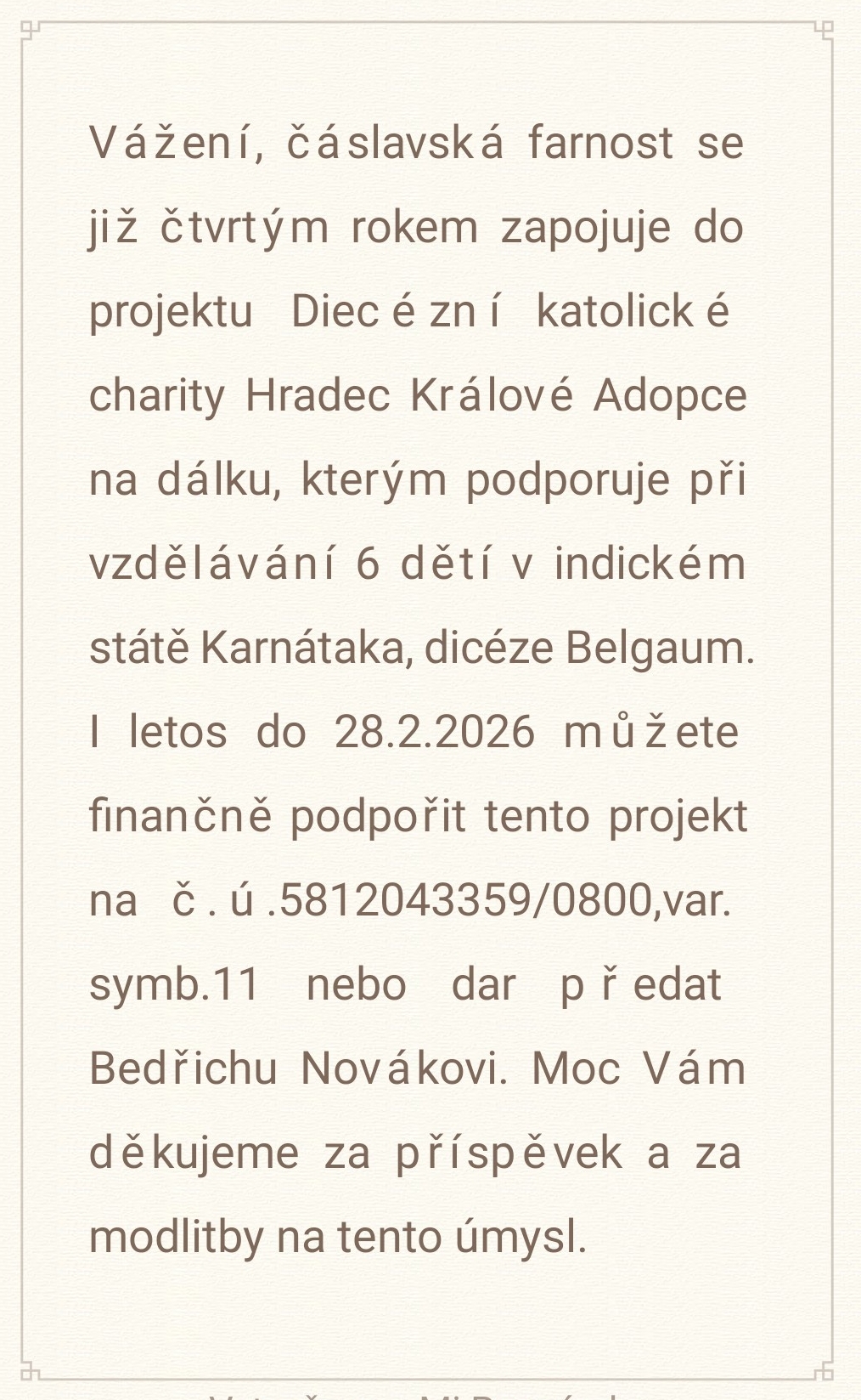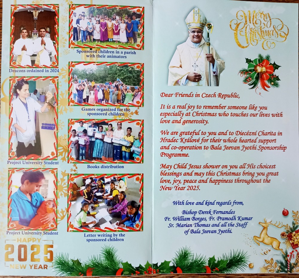 I v letošním roce 2025 čáslavská farnost pořádá sbírku na pomoc dětem v Indii v rámci projektu Charity Adopce na dálku. Při vzdělávání již třetím rokem podporujeme šest dětí - Aryana, Faustinu , Elenu, Jaswina, Aradhanu a Christyho při jejich vzdělávání. Sbírka se koná do konce měsíce února 2025. S finančním příspěvkem se můžete obracet na Bedřicha Nováka, popř. na mobil 602 684 529. Důkazem naší podpory je i pravidelná korespondence s dětmi (ukázka vánočního a novoročního přání, vysvědcění a dopis od jednoho z dětí).